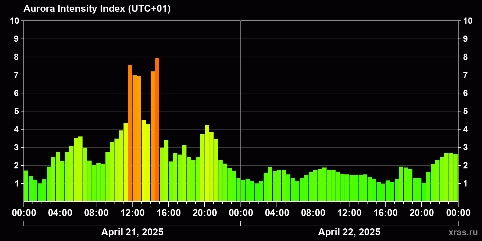 Changes in the auroral intensity index from 2025-04-21 to 2025-04-22 local time