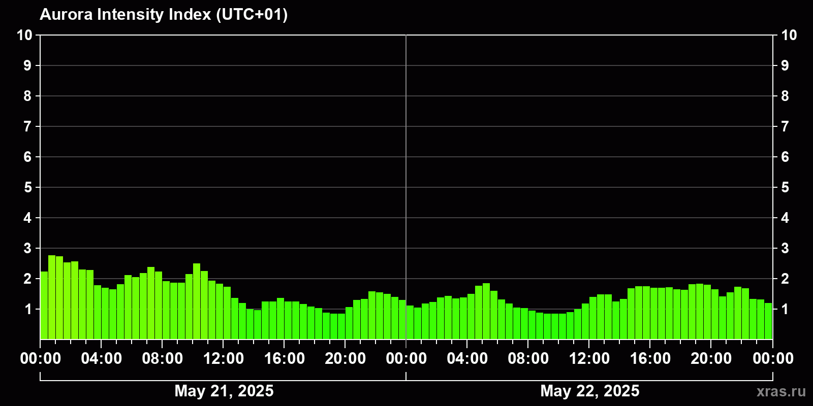 Auroral intensity index and the theoretically possible latitude of observations for nighttime in the Estern Hemisphere as of 2025-05-22 22:50 (end of day) local time