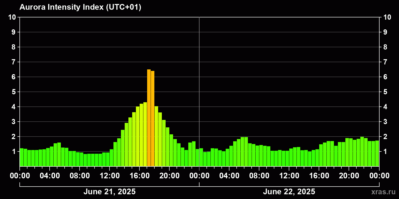 Changes in the auroral intensity index from 2025-06-21 to 2025-06-22 local time