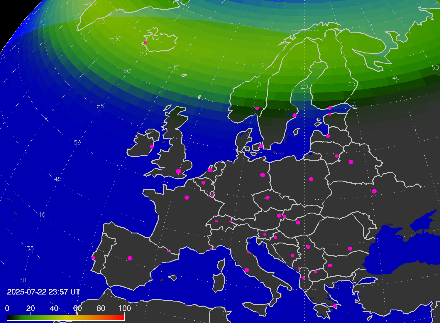 Probability of northern lights (auroras) in cities of Europe