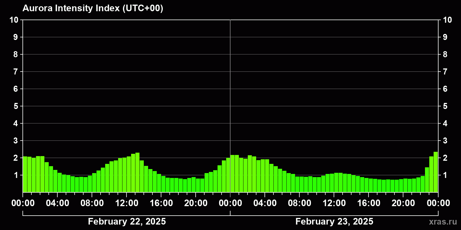 Auroral intensity index and the theoretically possible latitude of observations for nighttime in the Estern Hemisphere as of 2025-02-23 23:57 (end of day) local time
