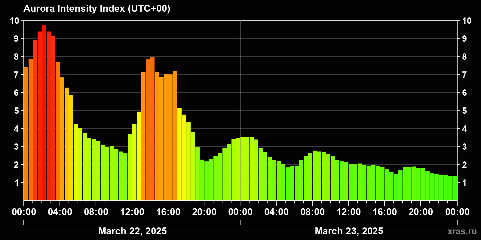 Auroral intensity index and the theoretically possible latitude of observations for nighttime in the Estern Hemisphere as of 2025-03-23 23:51 (end of day) local time