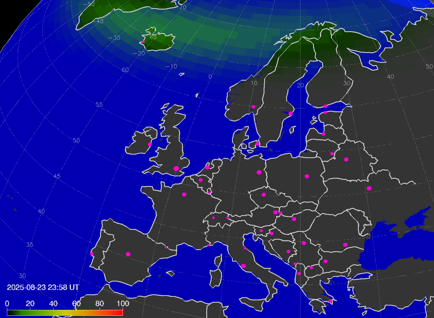 Probability of northern lights (auroras) in cities of Europe