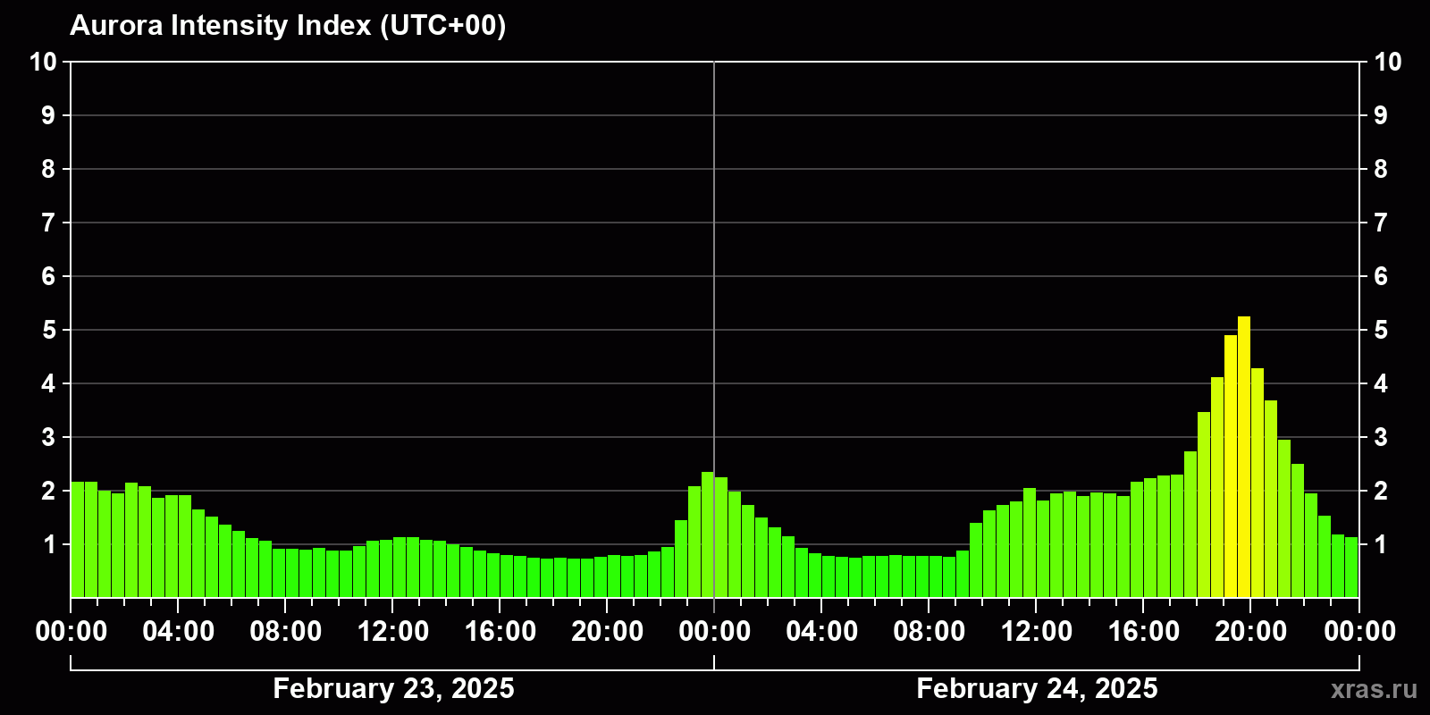 Auroral intensity index and the theoretically possible latitude of observations for nighttime in the Estern Hemisphere as of 2025-02-24 23:48 (end of day) local time