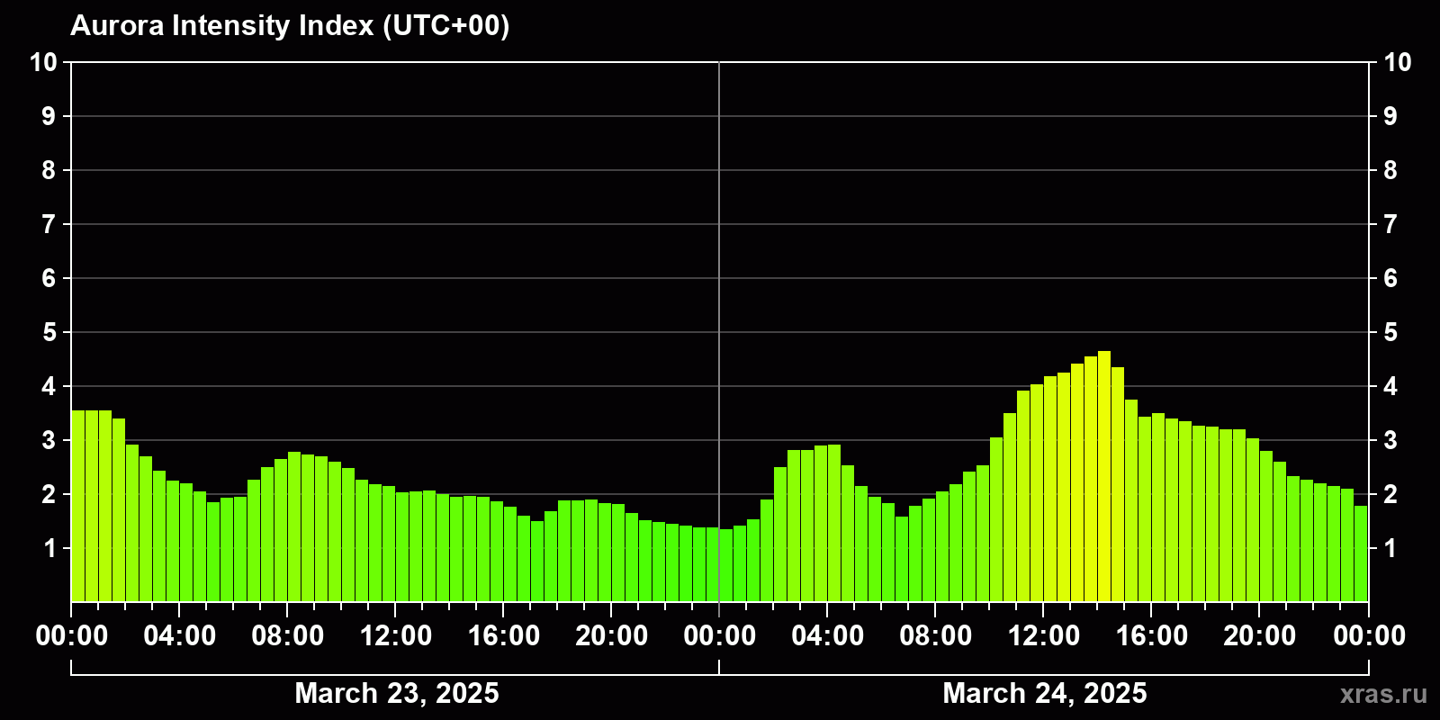 Auroral intensity index and the theoretically possible latitude of observations for nighttime in the Estern Hemisphere as of 2025-03-24 23:46 (end of day) local time