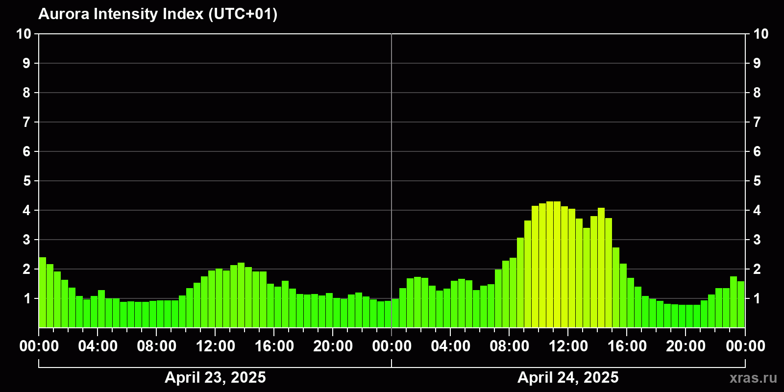 Auroral intensity index and the theoretically possible latitude of observations for nighttime in the Estern Hemisphere as of 2025-04-24 22:49 (end of day) local time