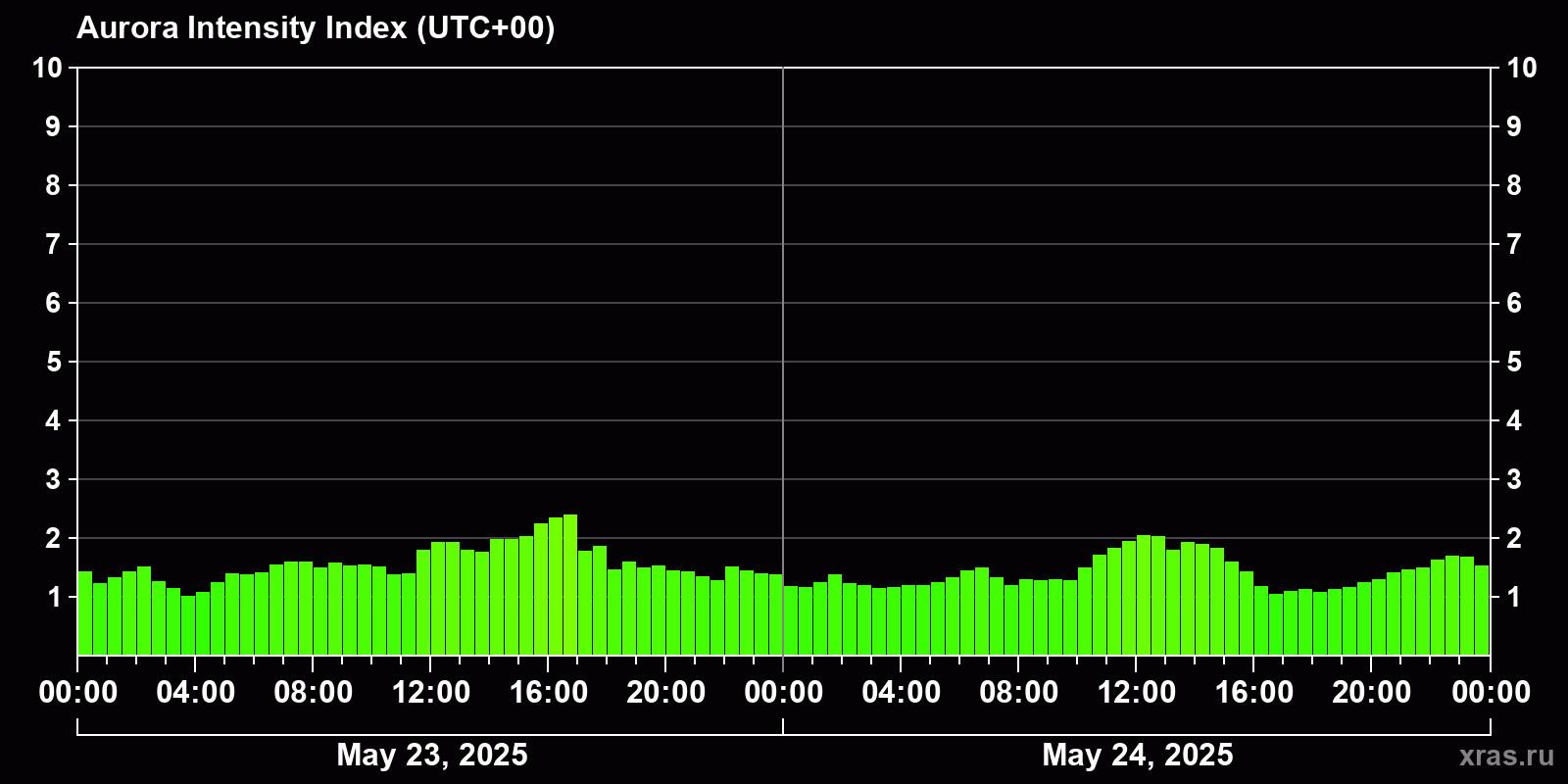 Auroral intensity index and the theoretically possible latitude of observations for nighttime in the Estern Hemisphere as of 2025-05-24 23:56 (end of day) local time