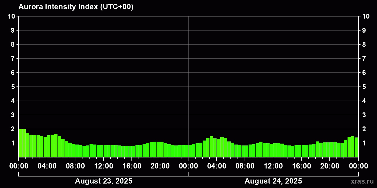 Auroral intensity index and the theoretically possible latitude of observations for nighttime in the Estern Hemisphere as of 2025-08-24 23:57 (end of day) local time