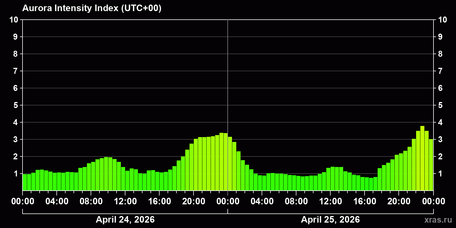 Changes in the auroral intensity index from 2026-04-24 to 2026-04-25 local time