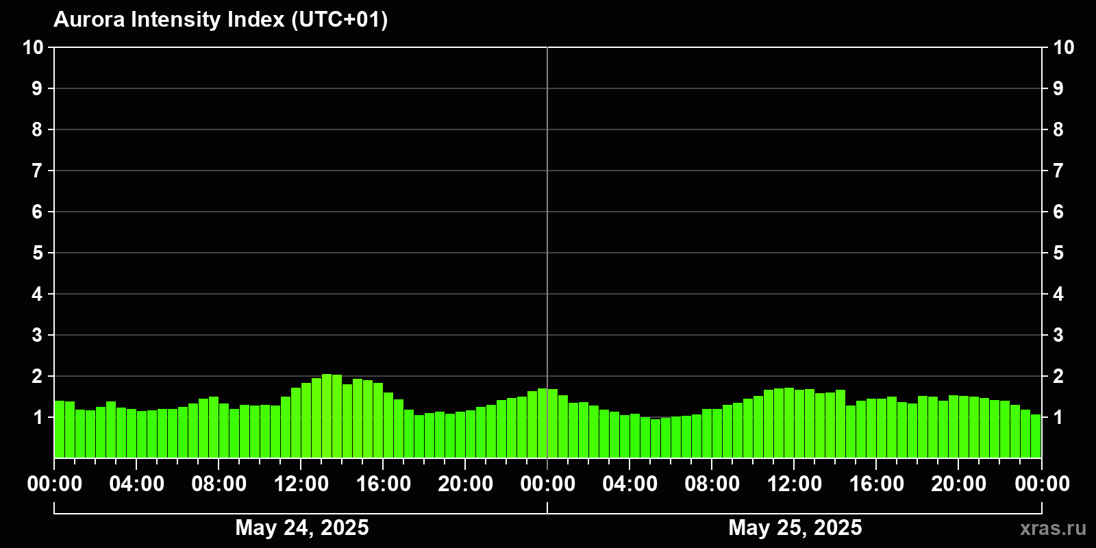 Changes in the auroral intensity index from 2025-05-24 to 2025-05-25 local time