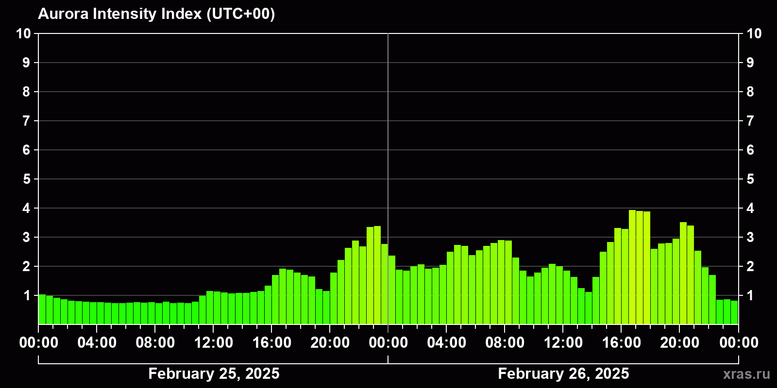 Auroral intensity index and the theoretically possible latitude of observations for nighttime in the Estern Hemisphere as of 2025-02-26 23:58 (end of day) local time