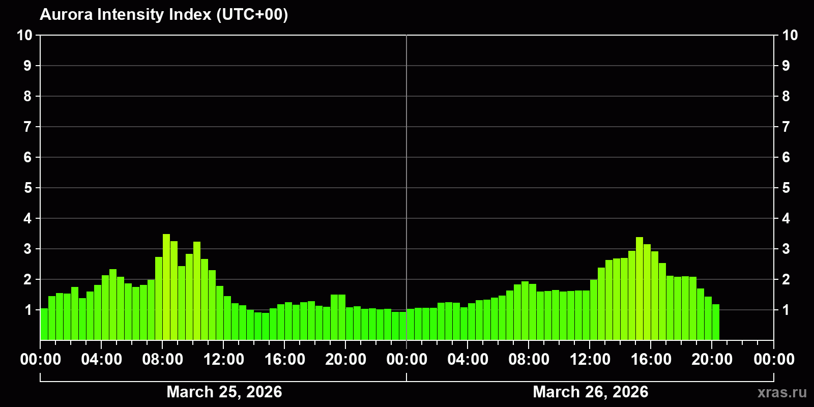 Changes in the auroral intensity index from 2026-03-25 to 2026-03-26 local time