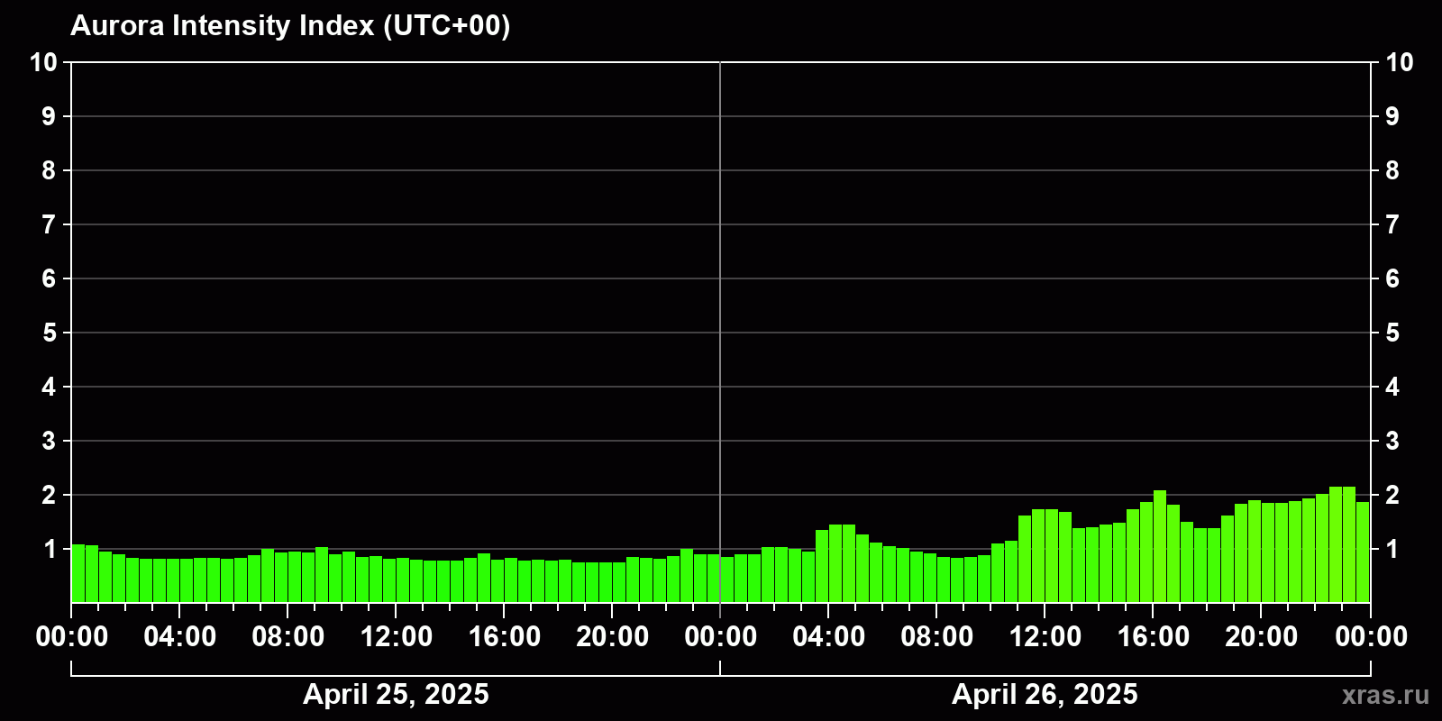 Auroral intensity index and the theoretically possible latitude of observations for nighttime in the Estern Hemisphere as of 2025-04-26 23:56 (end of day) local time