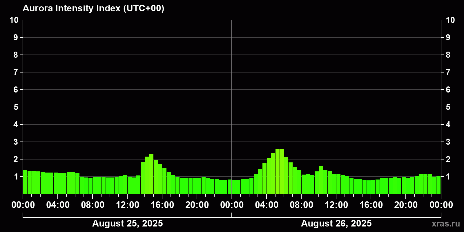 Changes in the auroral intensity index from 2025-08-25 to 2025-08-26 local time