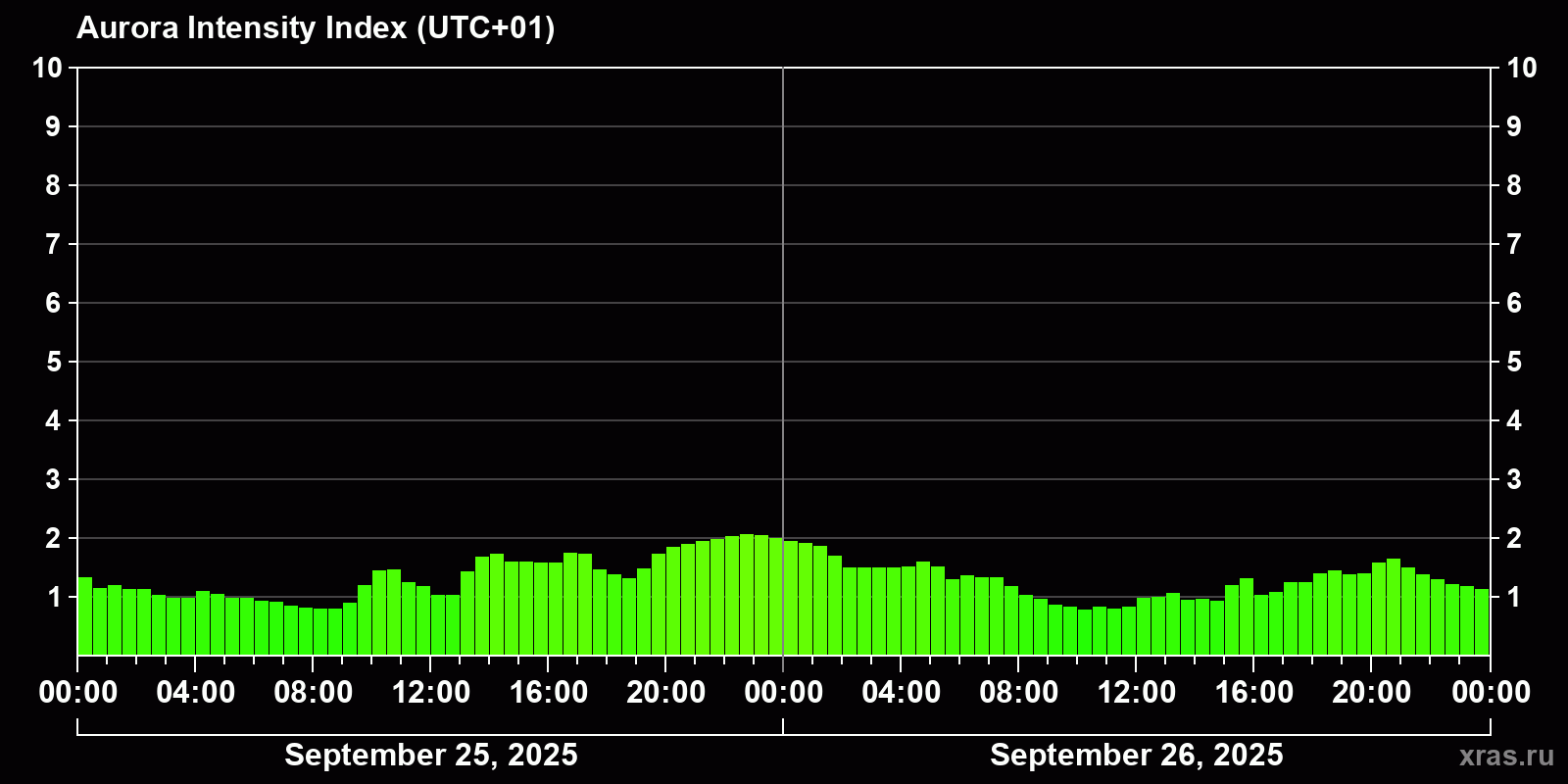 Auroral intensity index and the theoretically possible latitude of observations for nighttime in the Estern Hemisphere as of 2025-09-26 22:55 (end of day) local time