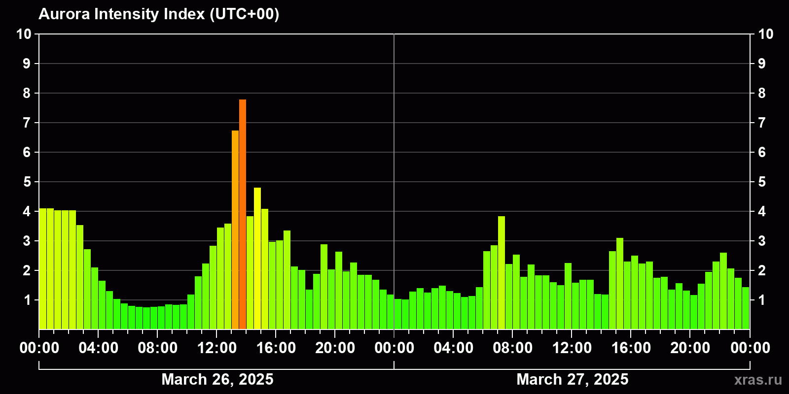 Changes in the auroral intensity index from 2025-03-26 to 2025-03-27 local time