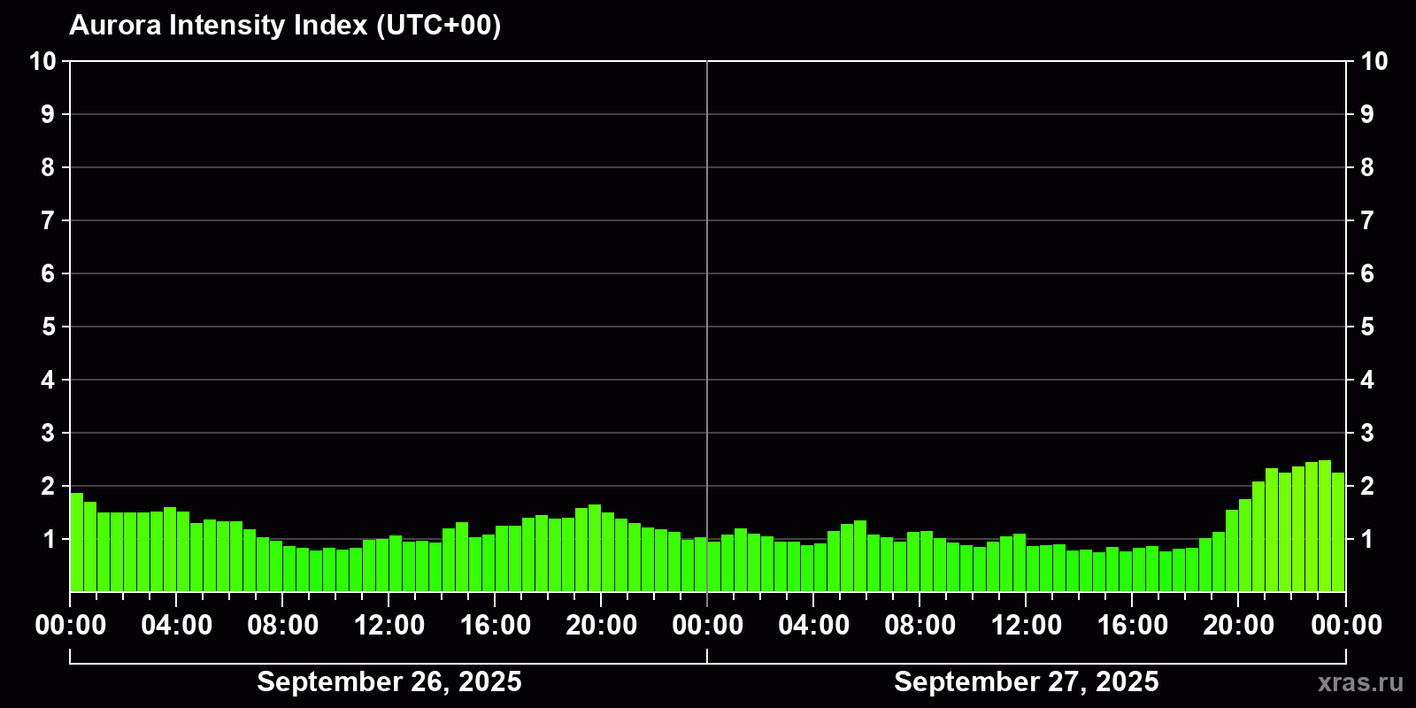 Auroral intensity index and the theoretically possible latitude of observations for nighttime in the Estern Hemisphere as of 2025-09-27 23:47 (end of day) local time