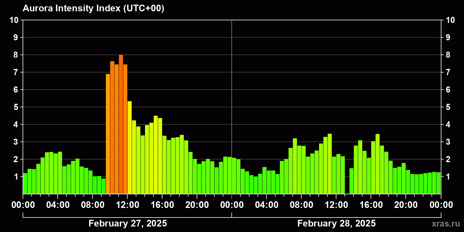 Changes in the auroral intensity index from 2025-02-27 to 2025-02-28 local time