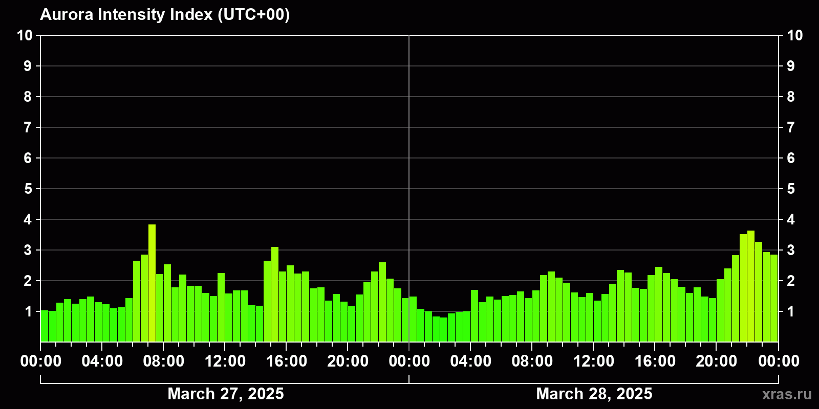 Auroral intensity index and the theoretically possible latitude of observations for nighttime in the Estern Hemisphere as of 2025-03-28 23:55 (end of day) local time