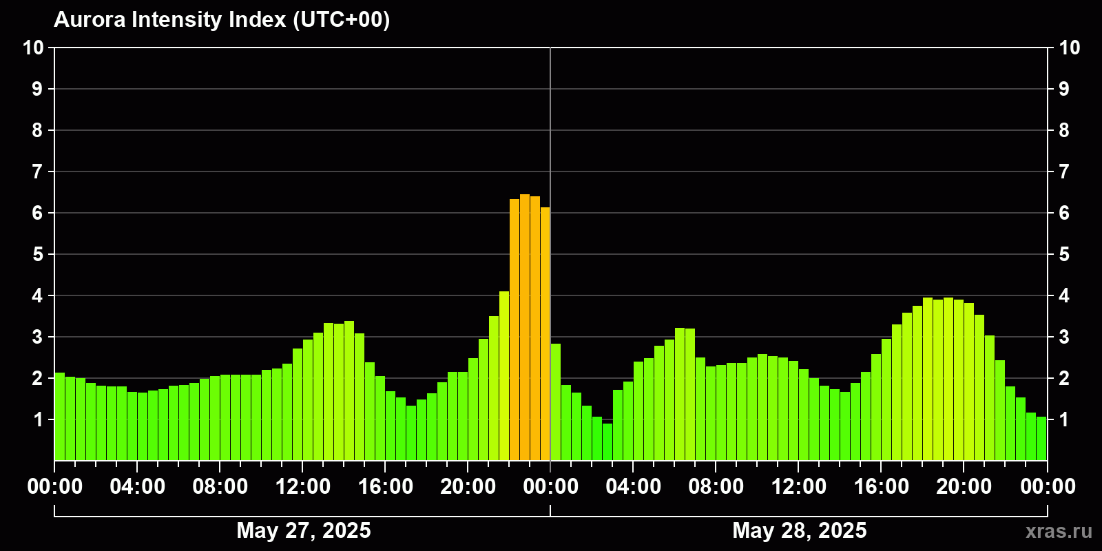Auroral intensity index and the theoretically possible latitude of observations for nighttime in the Estern Hemisphere as of 2025-05-28 23:51 (end of day) local time