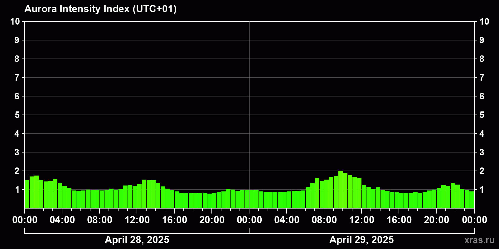 Changes in the auroral intensity index from 2025-04-28 to 2025-04-29 local time