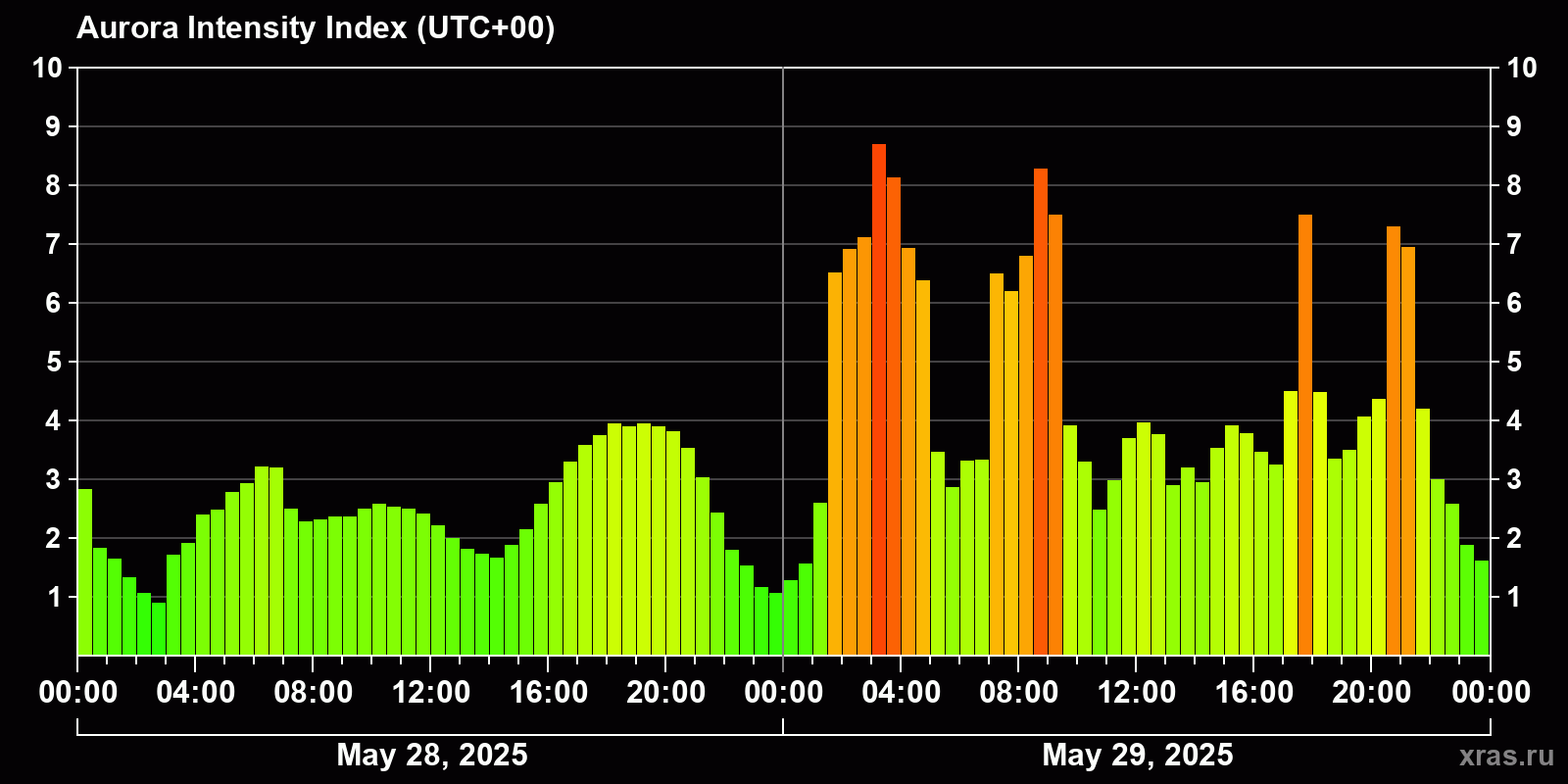 Changes in the auroral intensity index from 2025-05-28 to 2025-05-29 local time