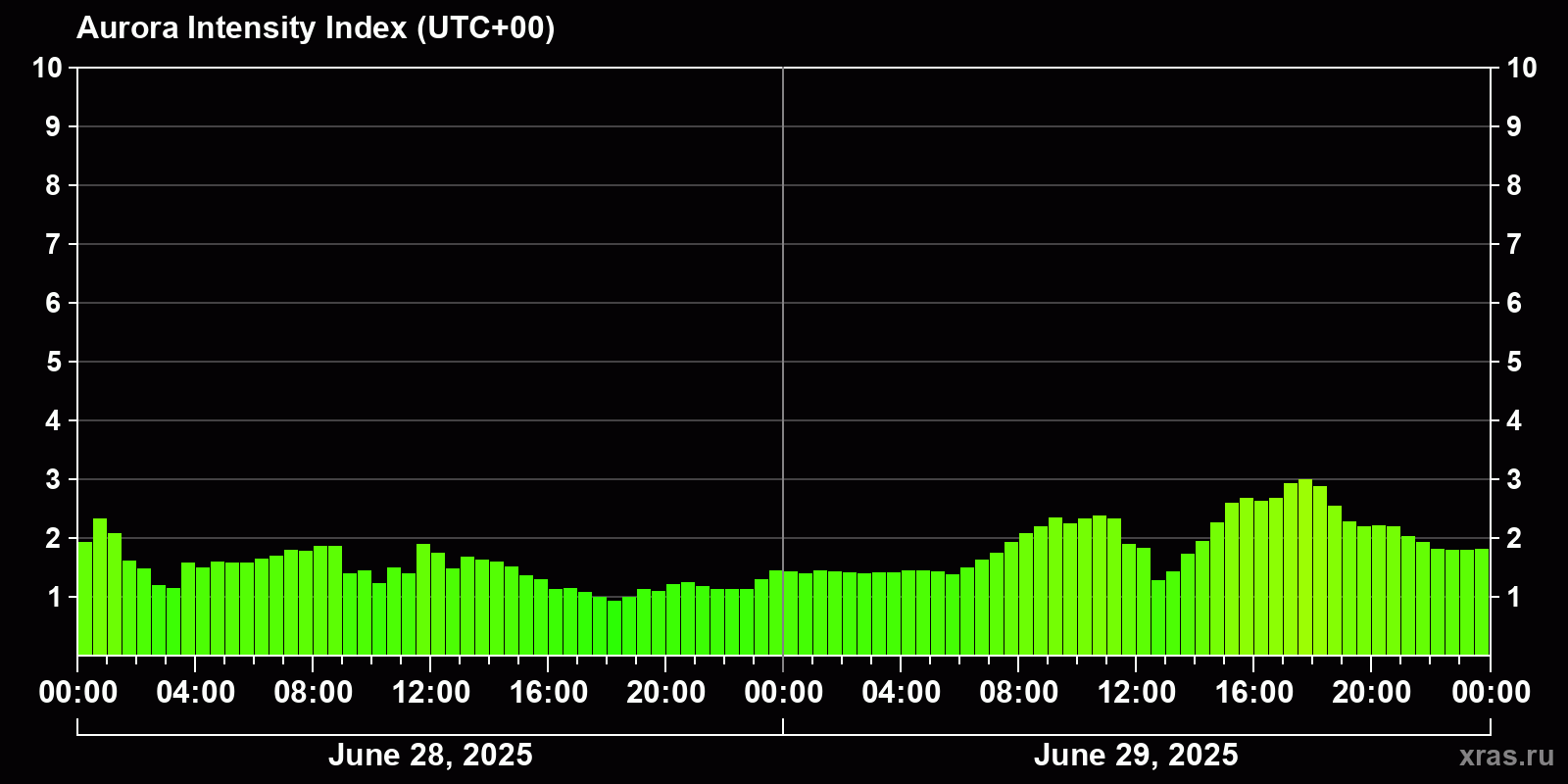 Changes in the auroral intensity index from 2025-06-28 to 2025-06-29 local time