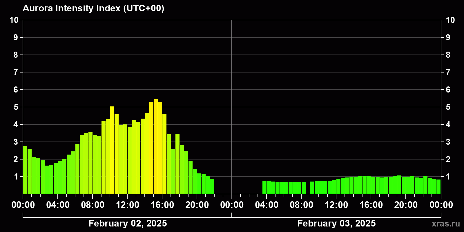 Changes in the auroral intensity index from 2025-02-02 to 2025-02-03 local time
