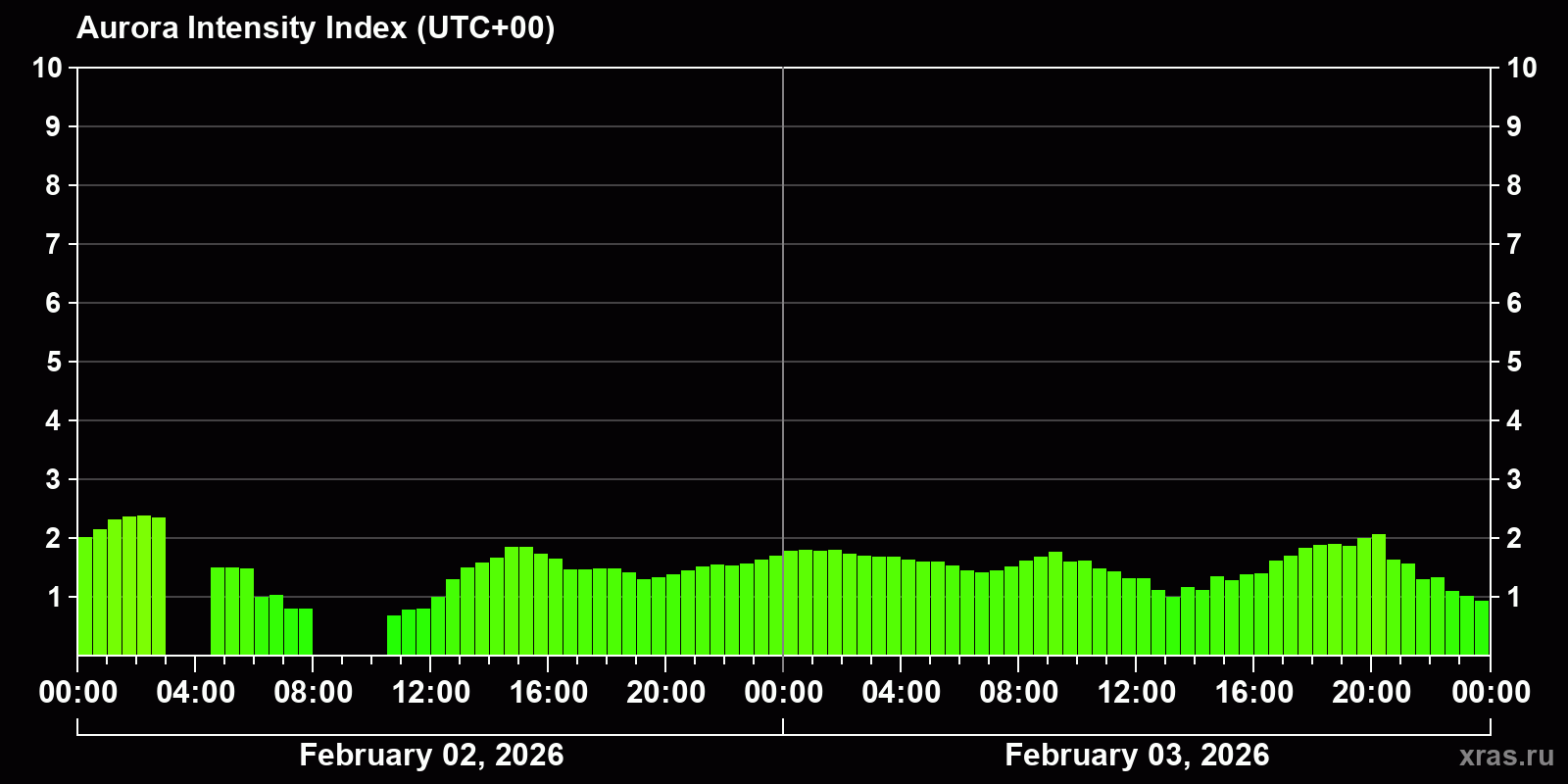 Changes in the auroral intensity index from 2026-02-02 to 2026-02-03 local time