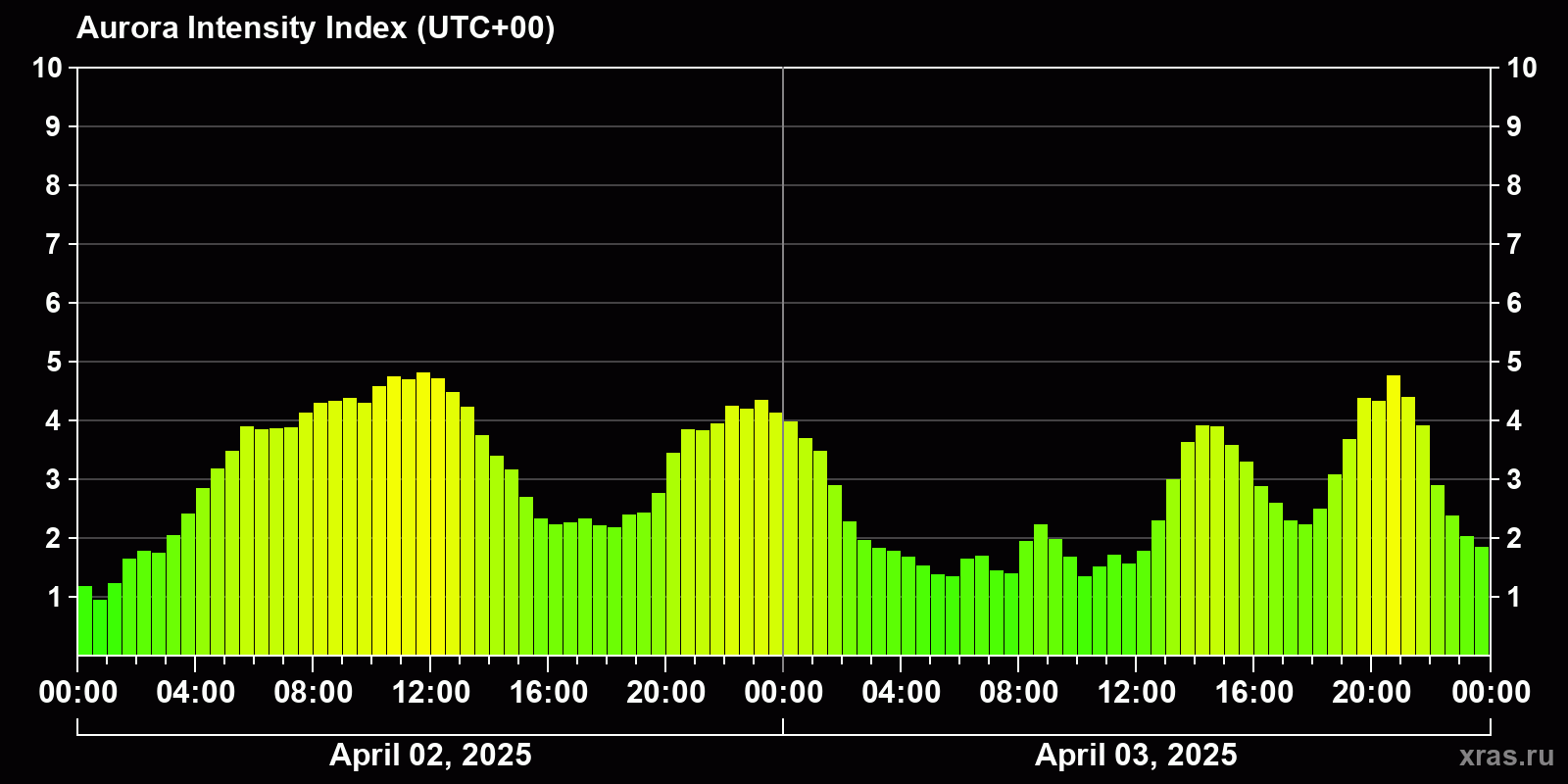 Changes in the auroral intensity index from 2025-04-02 to 2025-04-03 local time