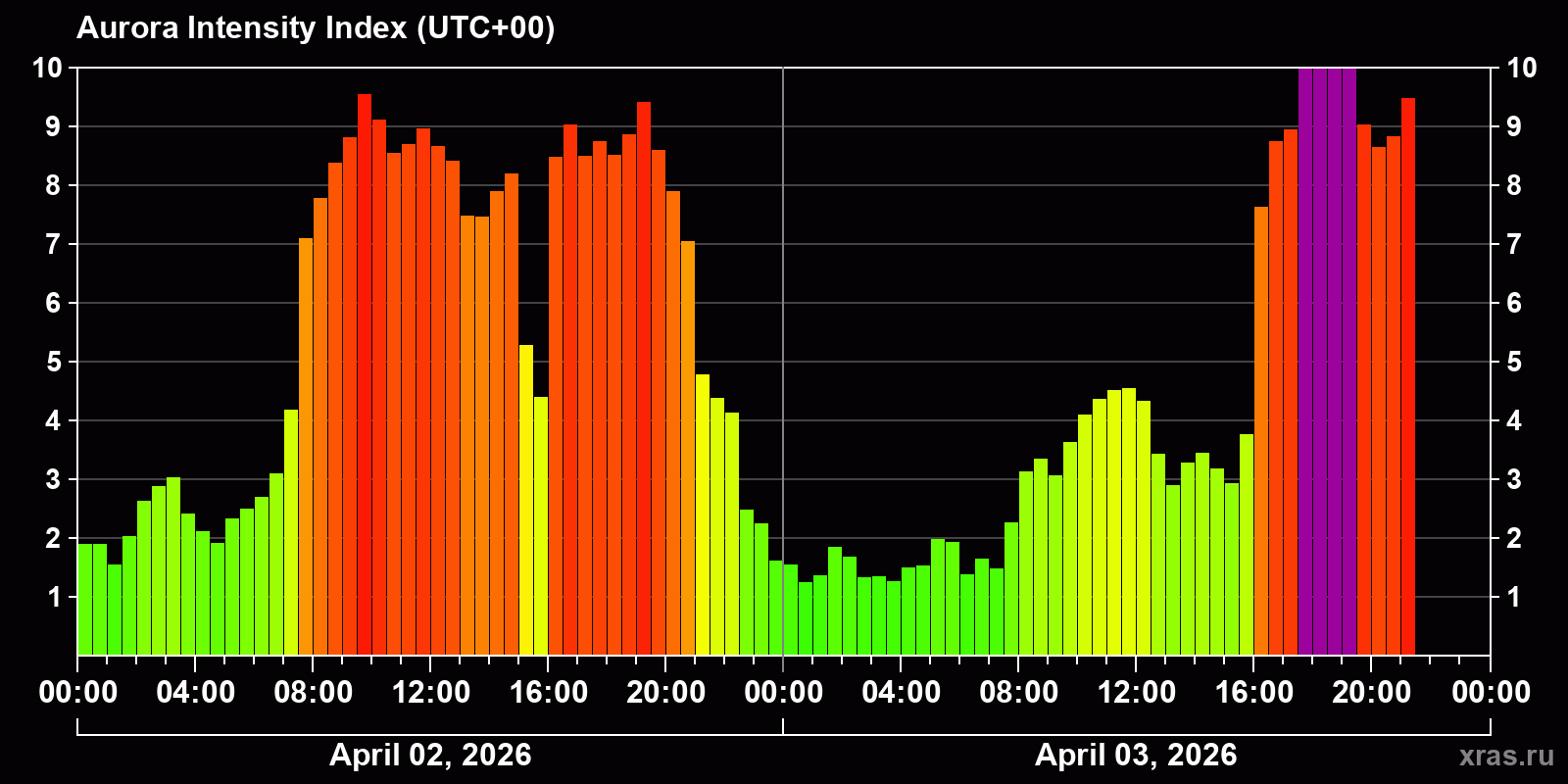 Auroral intensity index and the theoretically possible latitude of observations for nighttime in the Estern Hemisphere as of 2026-04-03 19:37 (end of day) local time