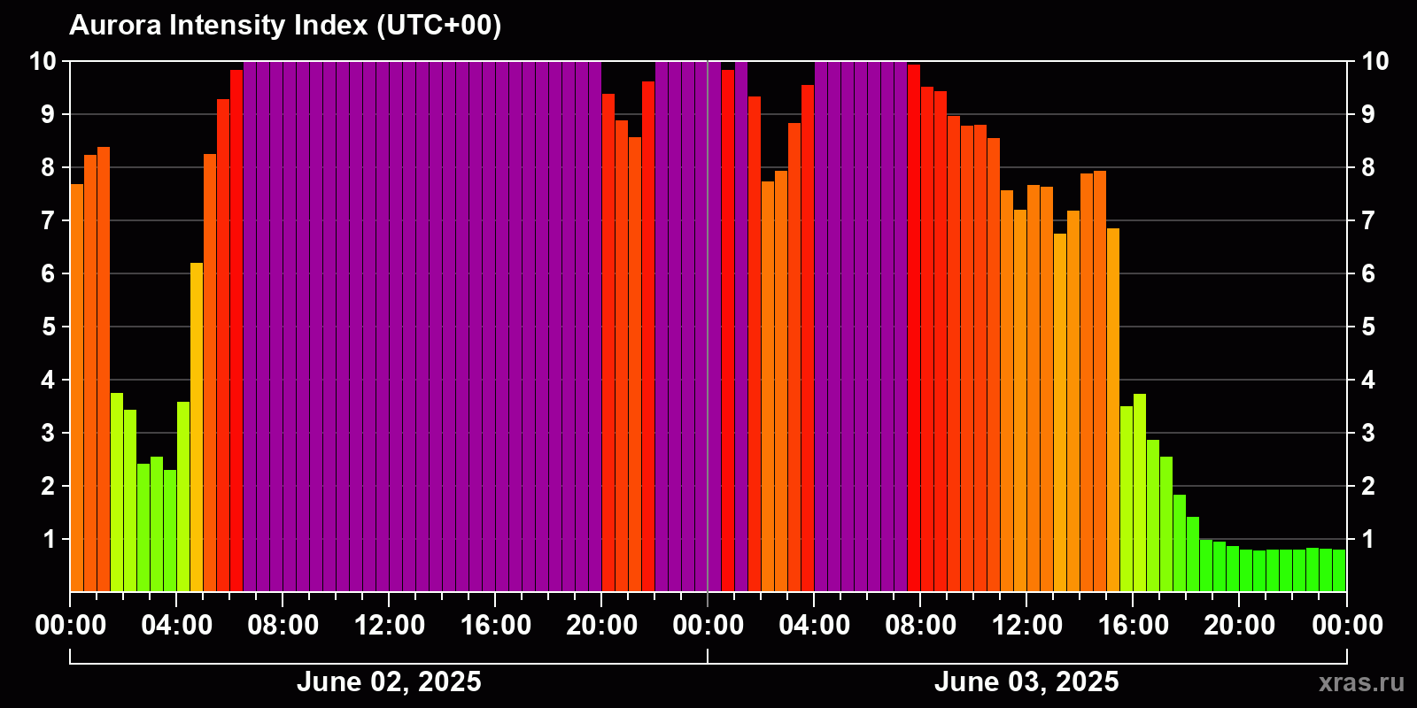 Auroral intensity index and the theoretically possible latitude of observations for nighttime in the Estern Hemisphere as of 2025-06-03 23:45 (end of day) local time