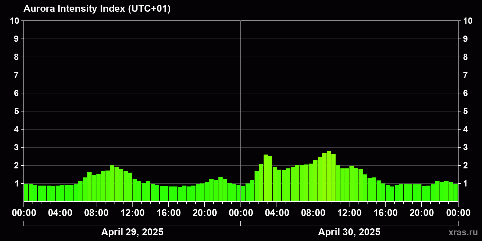 Changes in the auroral intensity index from 2025-04-29 to 2025-04-30 local time