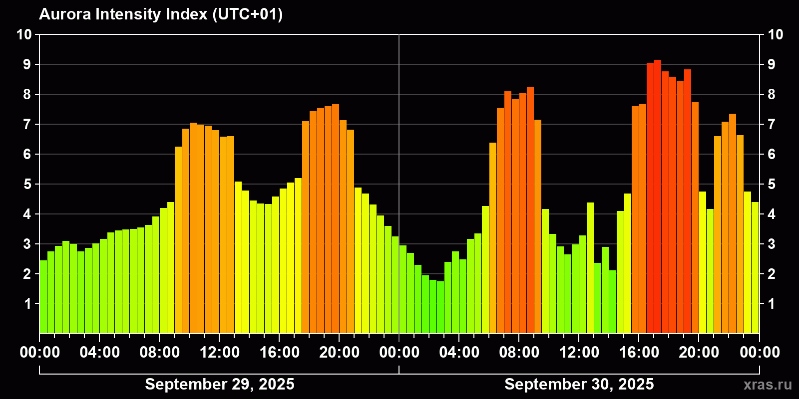 Auroral intensity index and the theoretically possible latitude of observations for nighttime in the Estern Hemisphere as of 2025-09-30 22:45 (end of day) local time