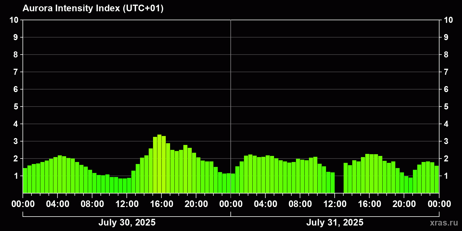 Changes in the auroral intensity index from 2025-07-30 to 2025-07-31 local time