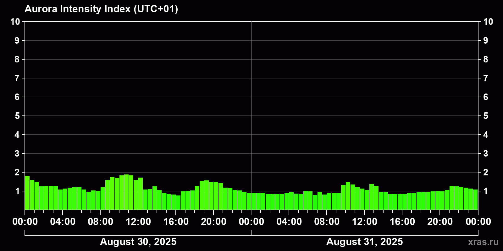 Changes in the auroral intensity index from 2025-08-30 to 2025-08-31 local time