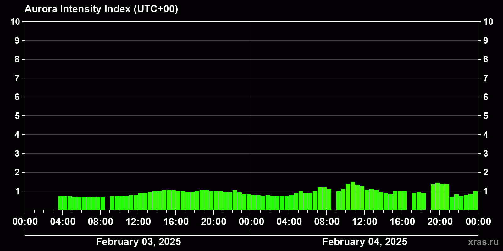 Auroral intensity index and the theoretically possible latitude of observations for nighttime in the Estern Hemisphere as of 2025-02-04 23:50 (end of day) local time