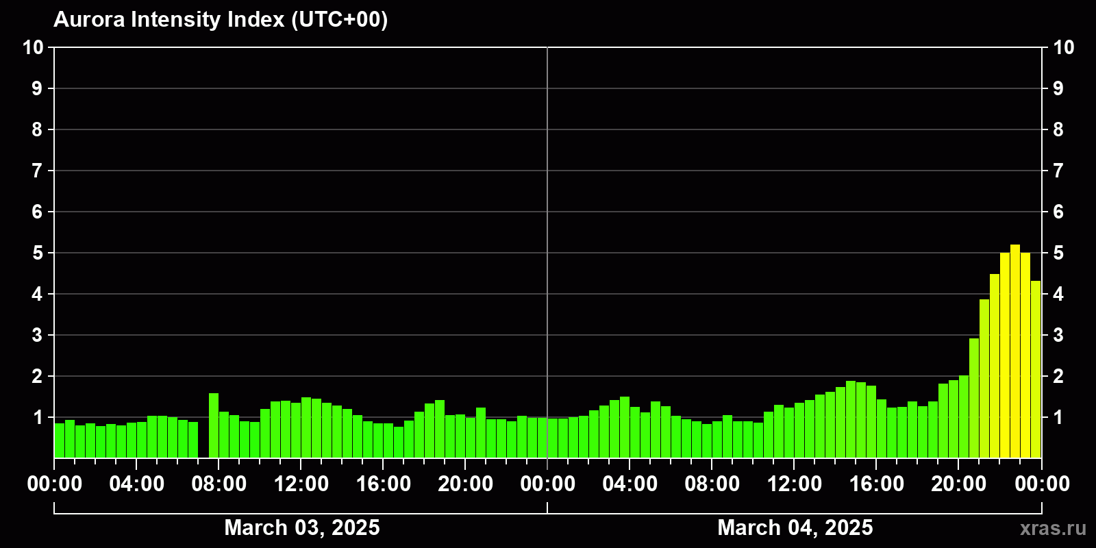 Auroral intensity index and the theoretically possible latitude of observations for nighttime in the Estern Hemisphere as of 2025-03-04 23:57 (end of day) local time