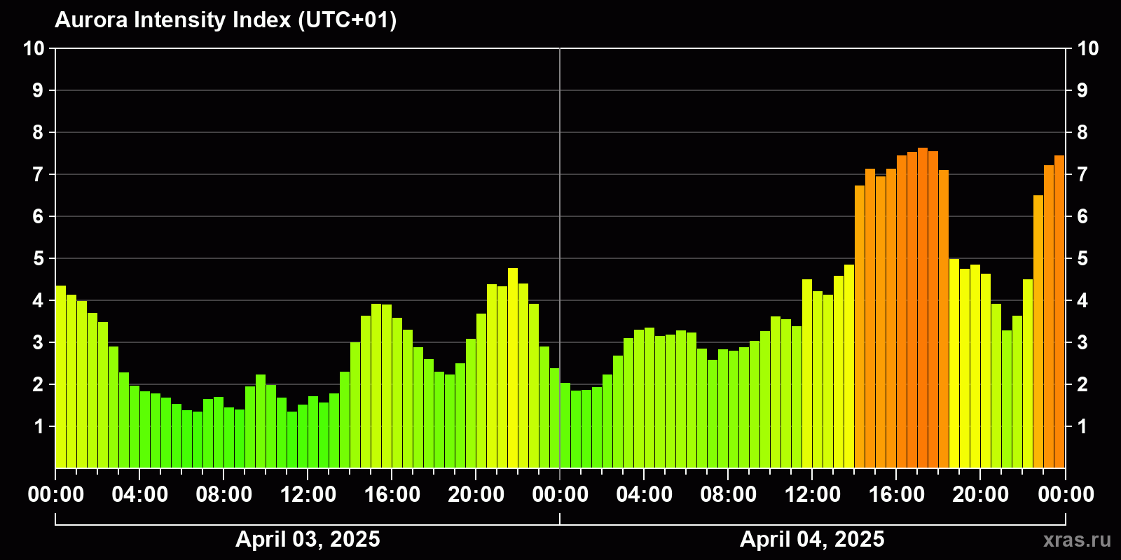Changes in the auroral intensity index from 2025-04-03 to 2025-04-04 local time