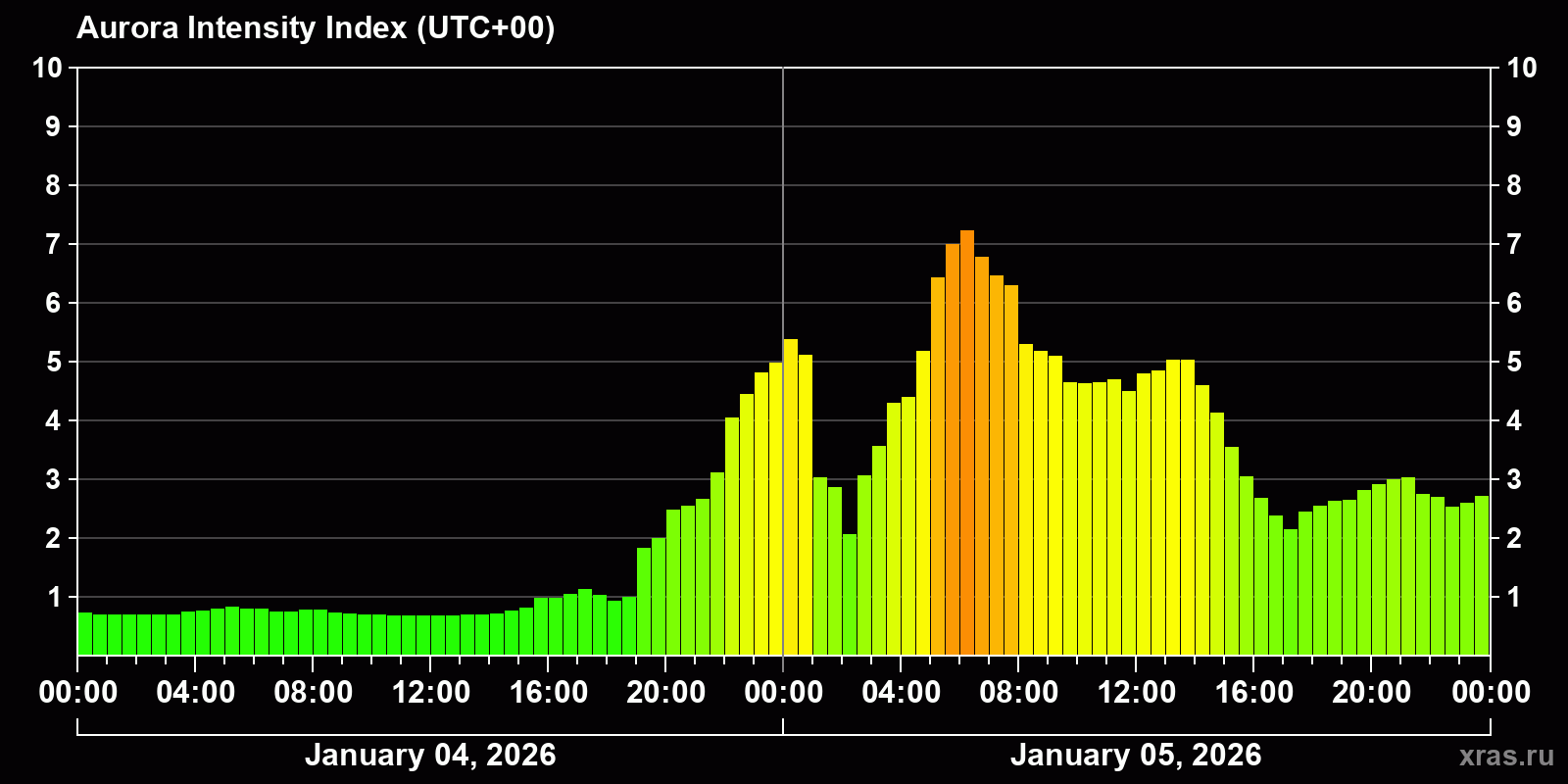 Changes in the auroral intensity index from 2026-01-04 to 2026-01-05 local time