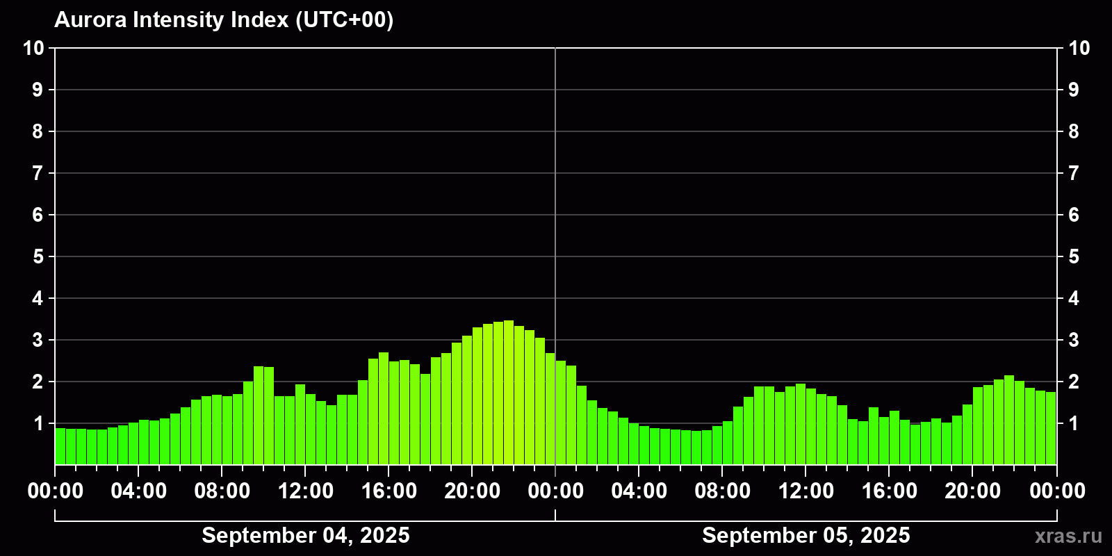 Changes in the auroral intensity index from 2025-09-04 to 2025-09-05 local time