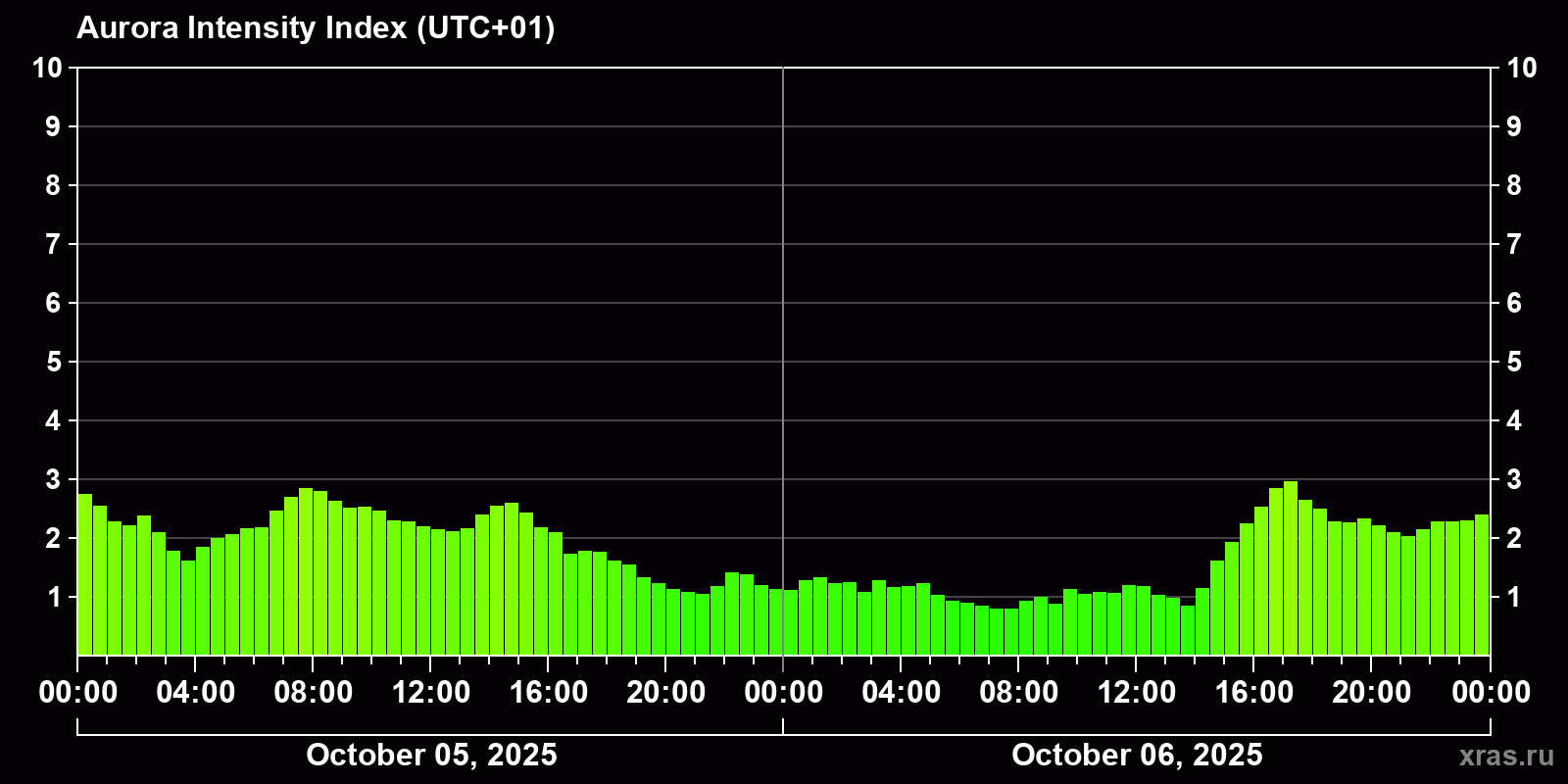 Changes in the auroral intensity index from 2025-10-05 to 2025-10-06 local time