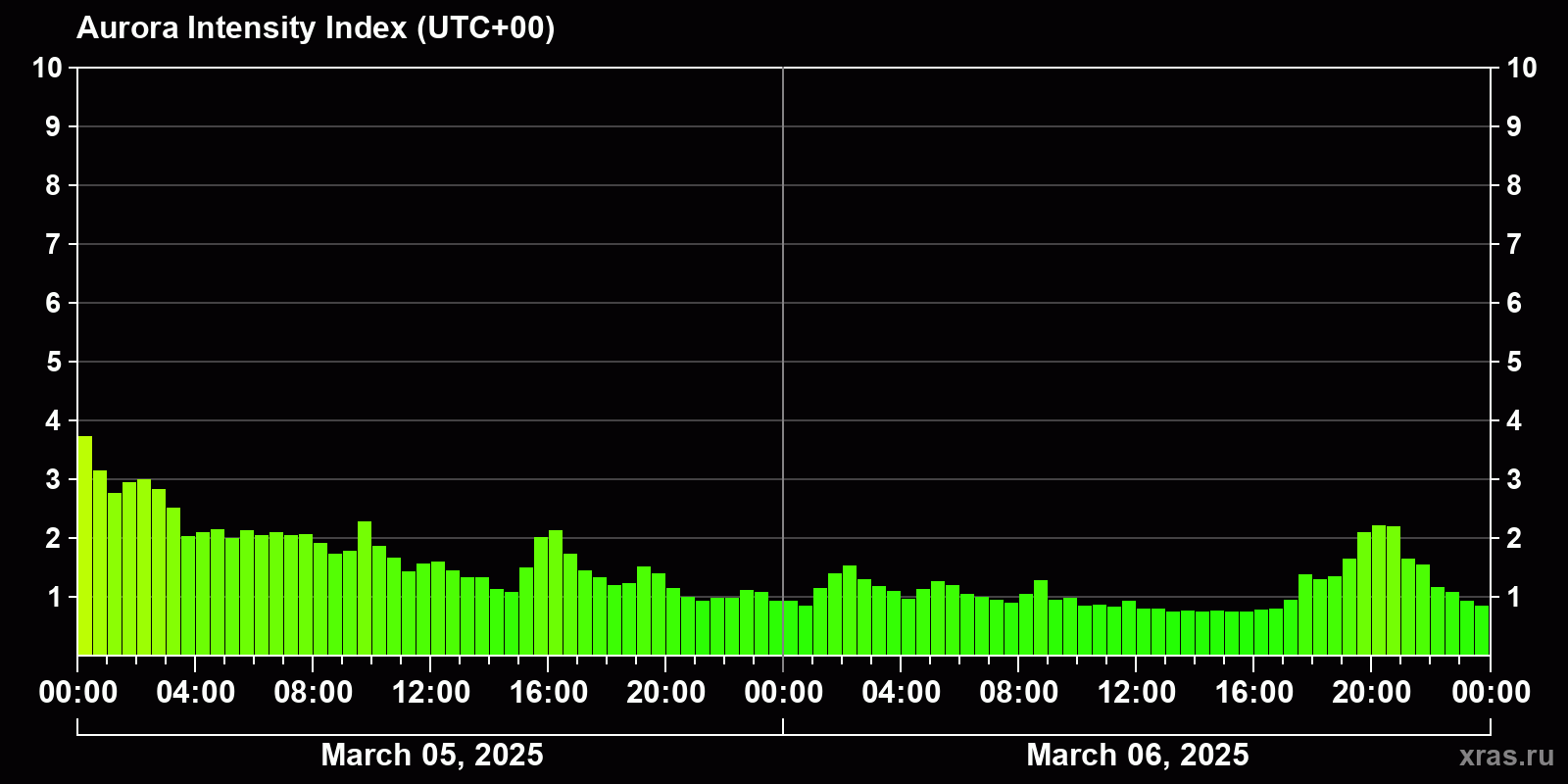 Auroral intensity index and the theoretically possible latitude of observations for nighttime in the Estern Hemisphere as of 2025-03-06 23:58 (end of day) local time