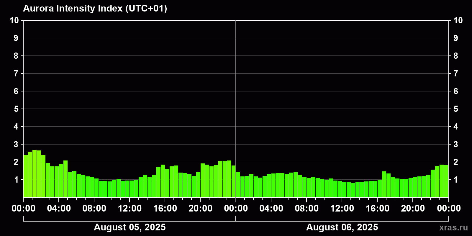 Changes in the auroral intensity index from 2025-08-05 to 2025-08-06 local time