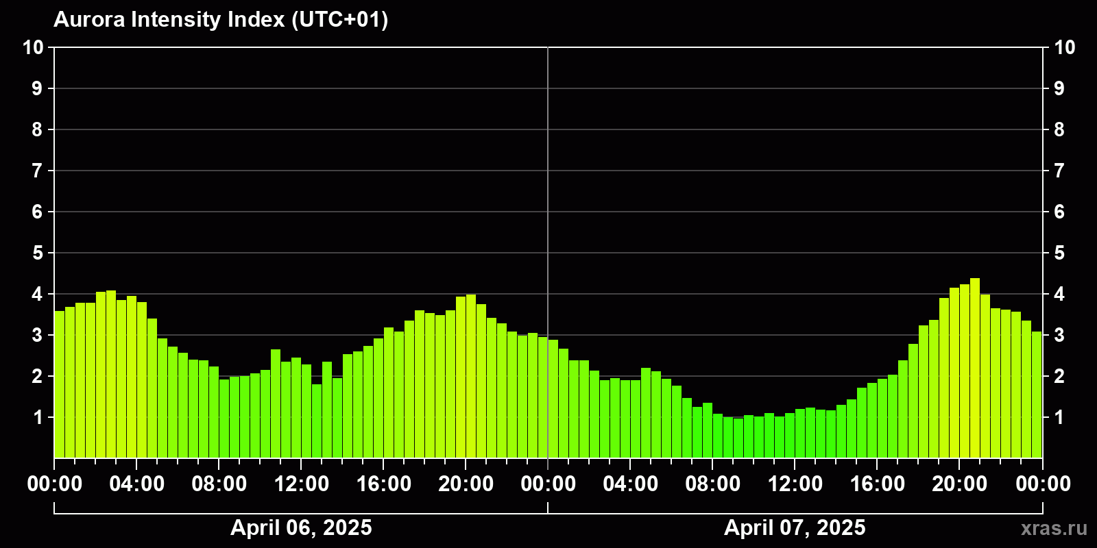 Auroral intensity index and the theoretically possible latitude of observations for nighttime in the Estern Hemisphere as of 2025-04-07 22:53 (end of day) local time
