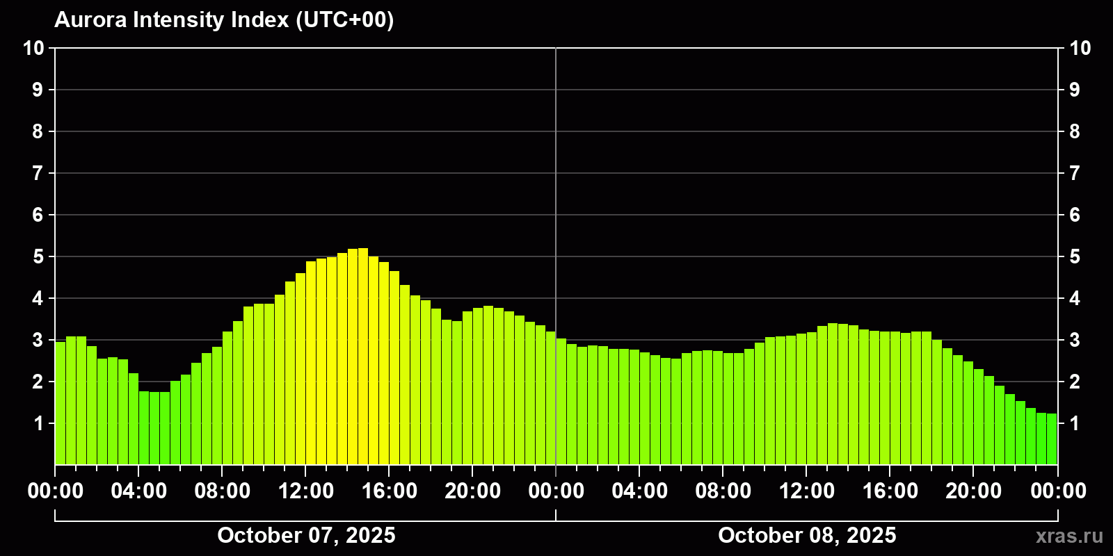 Auroral intensity index and the theoretically possible latitude of observations for nighttime in the Estern Hemisphere as of 2025-10-08 23:56 (end of day) local time