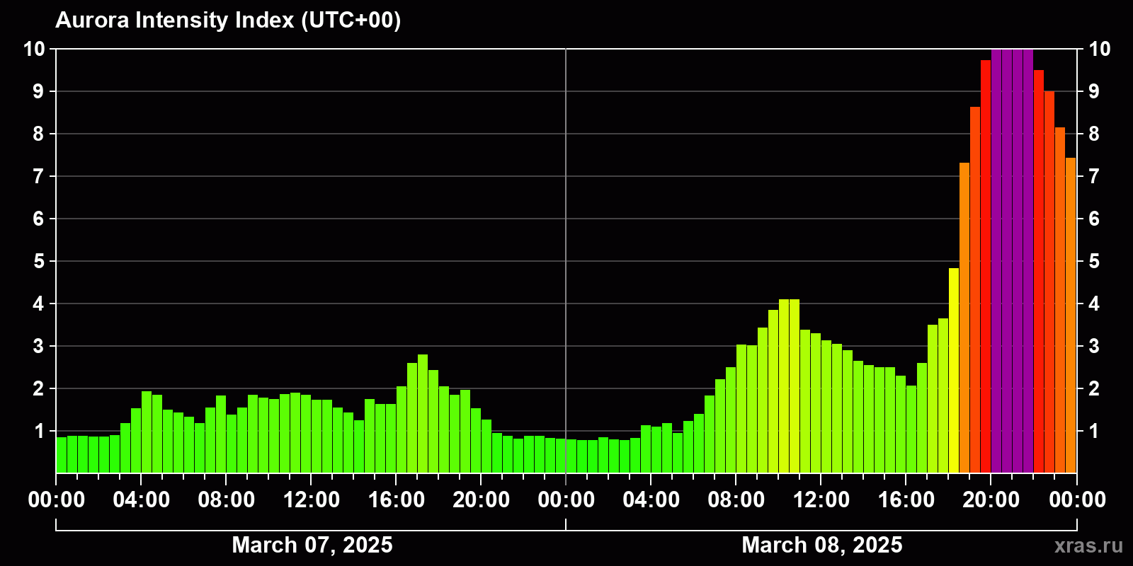 Changes in the auroral intensity index from 2025-03-07 to 2025-03-08 local time