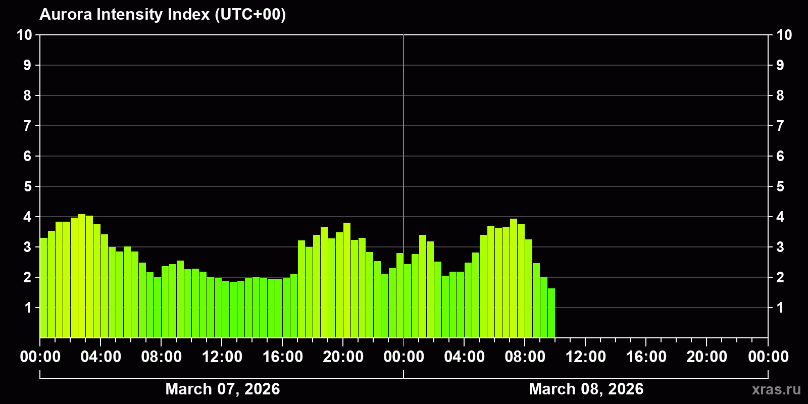 Auroral intensity index and the theoretically possible latitude of observations for nighttime in the Estern Hemisphere as of 2026-03-08 08:44 (end of day) local time