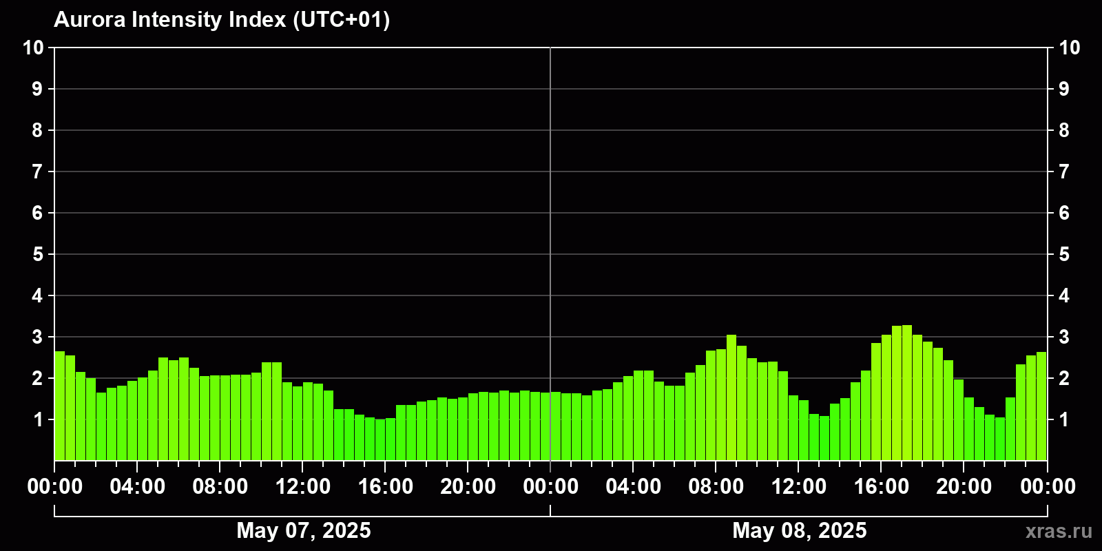 Auroral intensity index and the theoretically possible latitude of observations for nighttime in the Estern Hemisphere as of 2025-05-08 22:55 (end of day) local time