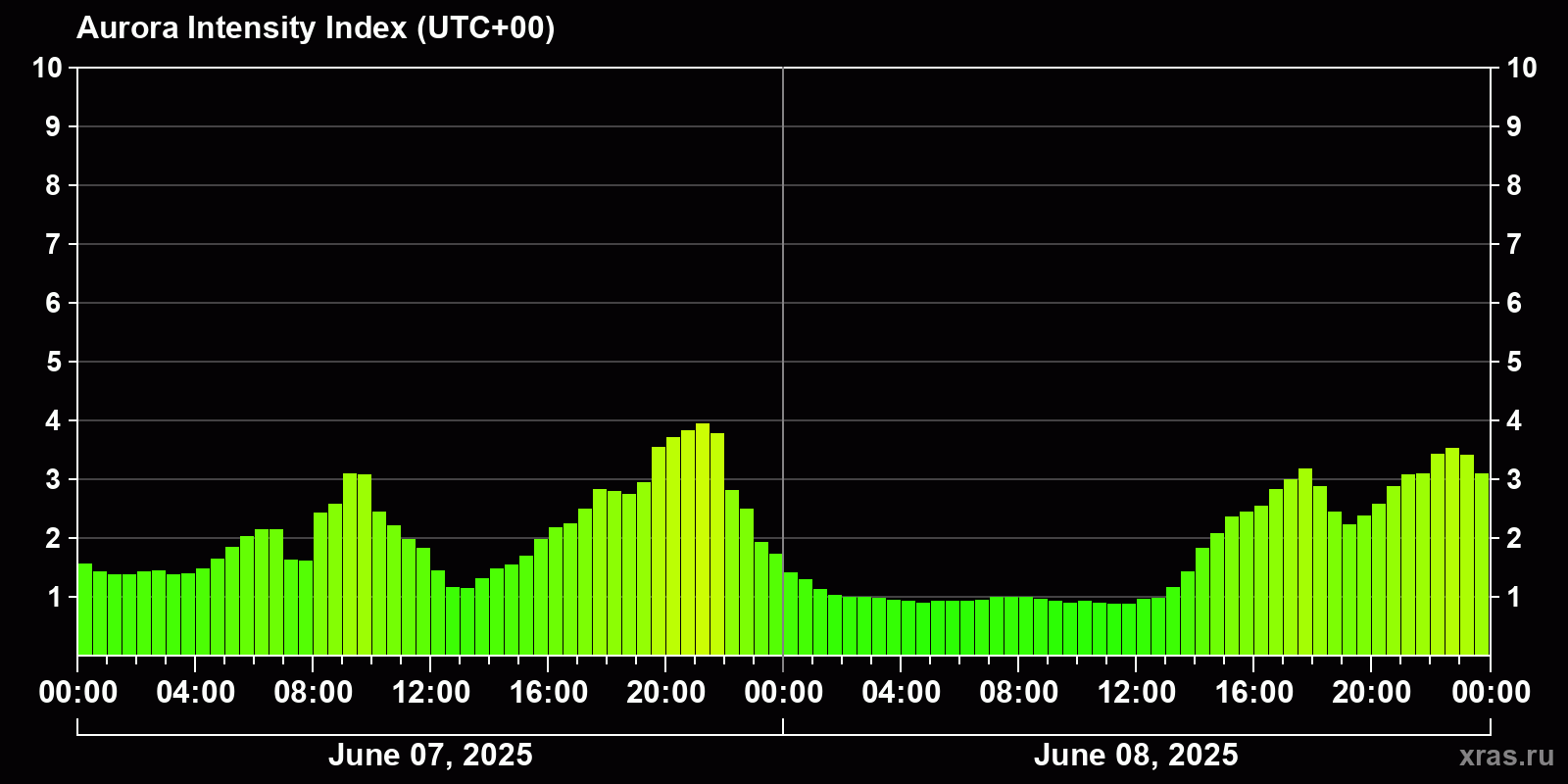 Auroral intensity index and the theoretically possible latitude of observations for nighttime in the Estern Hemisphere as of 2025-06-08 23:48 (end of day) local time